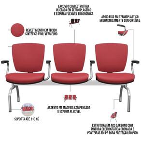 Cadeira Longarina 3 Lugares Aeroporto Recepção Cromado Baixa Flexi P03 Vinil Vermelho - Lyam