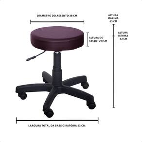 Características Técnicas: • Marca: For-ty • Assento sem encosto e sem aro • Sistema giratório 360° • Regulagem de altura por pistão a gás (52 cm a 65 cm) • Base pentápé com rodízios de alta resistência • Assento com 38 cm de diâmetro e 8 cm de altura • Estofado em tecido Facto, resistente ao uso de álcool 70% • Peso suportado: até 120 kg • Indicado para uso em diversos segmentos • Dimensões da embalagem: 56 (A) x 55 (L) x 25 (P) cm • Peso do produto: 4 kg