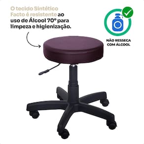 O assento tem 38 cm de diâmetro e 8 cm de altura, sendo estofado com tecido Facto, material resistente e durável, compatível com limpeza com álcool 70%, ideal para ambientes que exigem alto padrão de higiene.