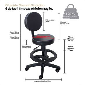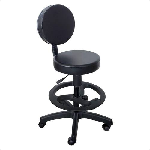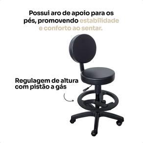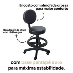 Cadeira Mocho com Encosto, Base Pentapé, Aro de apoio, Courvin Sintético, Regulagem de Altura por pistão a Gás, Base Pentapé – Suporta até 120kg
