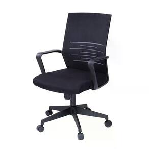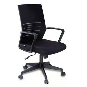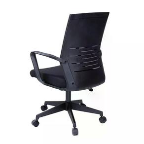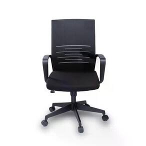 Possui superfície em malha, encosto e apoio de braço fixo em plástico.