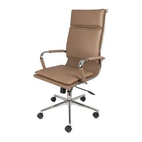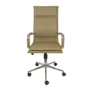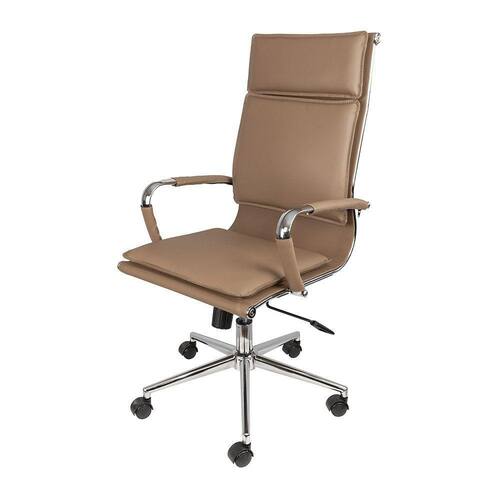 Cadeira Office Soft Alta Caramelo - com encosto acolchoado para um melhor conforto, estrutura em aço cromado e revestida em PU, possui regulagem de altura do assento com pistão á gás e sistema relax, possui base giratória em aço cromado com rodízios.