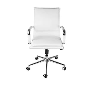 Cadeira Office Soft Baixa Branca - com encosto acolchoado para um melhor conforto, estrutura em aço cromado e revestida em PU, possui regulagem de altura do assento com pistão á gás e sistema relax, possui base giratória em aço cromado com rodízios.