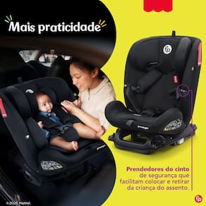 Prática no dia a dia, conta com prendedores laterais para as linguetas do cinto, facilitando colocar e retirar a criança, e capa totalmente lavável para manutenção simples.