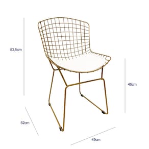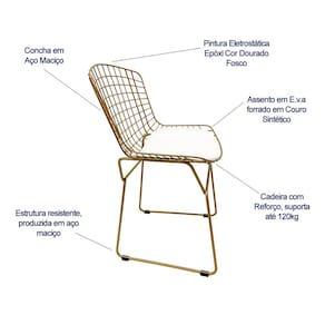 - Nossa cadeira é produzida toda em aço maciço e em sua composição contém os ferros: 7/16", 5/16" e arame de 4mm. É revestida com pintura eletrostática epóxi na cor dourado fosco e possui assento composto de uma camada de e.v.a revestido em material sintético na cor branco.