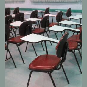 Cadeira Universitária do tipo Secretária, com estrutura metálica e prancheta em madeira.