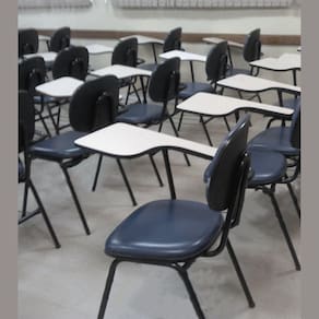 Cadeira Universitária do tipo Secretária, com estrutura metálica e prancheta em madeira.