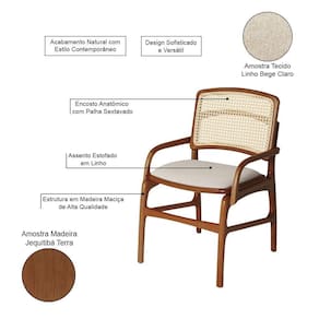 AS IMAGENS SÃO MERAMENTE ILUSTRATIVAS E PODEM SOFRER VARIAÇÕES DE COR E PEQUENOS DETALHES DE ACORDO COM O SEU MONITOR, ILUMINAÇÃO DO AMBIENTE E ATÉ MESMO A SUA PERCEPÇÃO VISUAL.Cadeira para Jantar FlorenÃa Madeira Jequitibà Terra - Linho Bege Encosto de Palha e com BraÃo