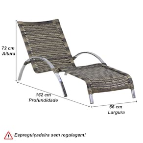 Espreguiçadeira Emily: - Altura total: 72 cm - Altura do assento ao chão: 27 cm - Largura: 66 cm - Profundidade: 162 cm - Suporta até 170 kg - Sem regulagem