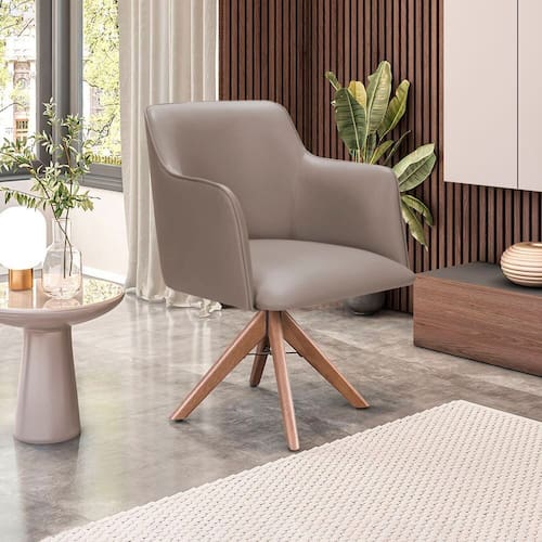 PRODUTO FABRICADO COM COMPENSADO PRENSADO E REVESTIDO COM SINTÉTICO. NO ASSENTO, INSTALAMOS A ESPUMA CONTÍNUA D28 SUPERSOFT. O ENCOSTO POSSUI ESPUMA D26 SUPERSOFT. POSSUI BASE GIRATÓRIA DE AÇO COM PÉS DE MADEIRA MACIÇA.