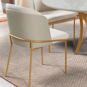 Cadeira Jantar Aurora Linho Bege Couro Pérola Pés Metal Dourado