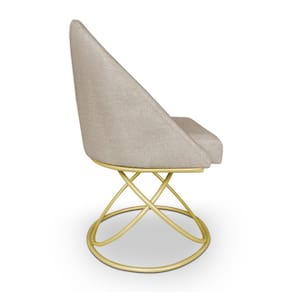 A base metálica em dourado confere à cadeira um aspecto industrial moderno, proporcionando um contraste encantador com o tecido em linho. Essa mistura de materiais agrega um ar contemporâneo e luxuoso ao ambiente, além de assegurar estabilidade e durabilidade à peça. O acabamento cuidadoso realça ainda mais a beleza e a qualidade do produto.