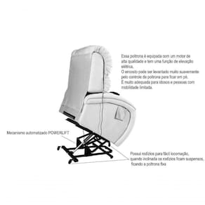 A Poltrona Imperial possui o mecanismo LIFT, esse mecanismo é ideal para idosos, pós cirurgico e pessoas com mobilidade reduzida, com dificuldade de locomoção ou usuários que tenham dificuldade para realizar transferência da posição sentada para de pé e vice-versa, que precisam de auxilio para levantar ou sentar. Com um design elegante, ela pode ser utilizada em casa dando mais autonomia, independência, qualidade de vida e um maior relaxamento. Com o sistema Lift a elevação e a inclinação torna-se mais fácil a ação de levantar, pois é acionado por um controle remoto exigindo menos esforço físico, poupando a musculatura e as articulações, diminuindo até 80% o impacto nos joelhos, além de exigir menos força abdominal e diminuir o esforço realizado pelo auxiliar ao ajudar o usuário a levantar.