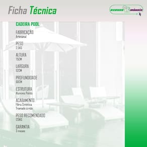 Caracteristicas: Estrutura em aluminio, leve, resistente e nao enferruja Acabamento em fibra sintetica anti-UV, ideal para ambientes externos Empilhavel, pratica para armazenar e organizar Vai montada, pronta para uso Suporta ate 120 kg