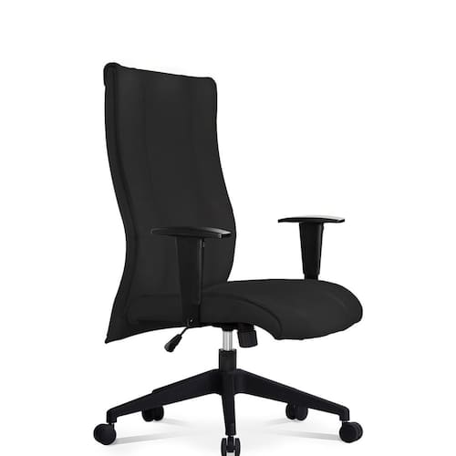 Cadeira giratória Infinity de espaldar alto com assento e encosto estruturado em madeira laminada e estofado com espuma laminada com densidade D28. Revestimento em sintético preto.