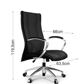 Cadeira giratória Infinity de espaldar alto com assento e encosto estruturado em madeira laminada e estofado com espuma laminada com densidade D28. Revestimento em sintético preto.