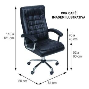 Cadeira Presidente Premium Oslo - 3321 CAFÉ A Cadeira Office Oslo OR Design é uma cadeira diferenciada da linha office. Ideal para aperfeiçoar e deixar o seu escritório ou sala de reuniões ainda mais confortável. Este modelo é extremamente elegante e inovador. Composição/Material: Assento em molas Pés/Base: Rodízio Cromado Assento Giratório Peso do Produto: 6 kg Peso Máximo Suportado: 100 kg Produto Entregue Desmontado (Necessita de Montagem) Acompanha peças + manual para montagem. Garantia contra defeitos de fabricação: 6 meses Dimensões da Cadeira Office Oslo OR Design Café: Largura: 64 cm Profundidade: 60 cm Altura: 52 - 60 cm Altura do chão ao encosto: 113 - 121 cm Altura do chão ao braço: 70 - 78 cm