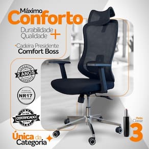 A Comfort Boss foi criada para quem busca uma cadeira de alto desempenho, com presença marcante e estrutura reforçada. Combina ergonomia, materiais premium e soluções técnicas que garantem conforto durante toda a jornada de trabalho.