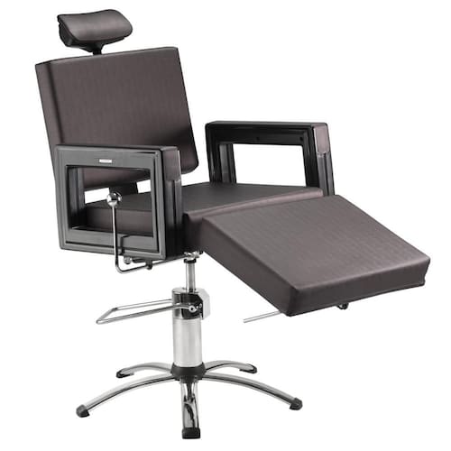 - Descanso de Pernas: Para maior conforto do cliente e ergonomia do profissional a cadeira Square Make possui descanso de pernas com acionamento por pistão pneumático, garantindo uma amplitude regulável de até 90°;