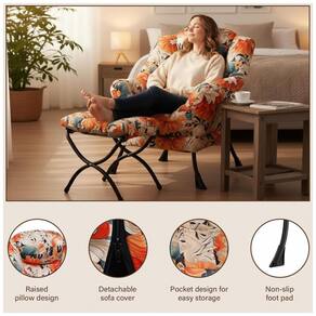 O revestimento em tecido possui capa removível, permitindo a retirada para limpeza, assim como a almofada do puff. A cadeira é indicada para leitura, descanso e uso em varandas cobertas, salas de estar, quartos e cantos de relaxamento, com montagem simples conforme instruções do fabricante.