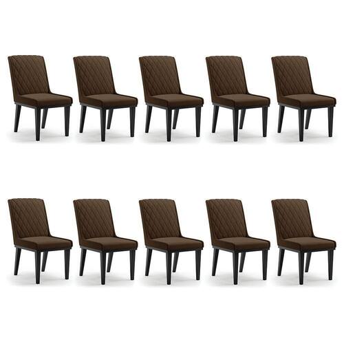 A Cadeira Sofia, é a opção ideal para quem quer um ambiente moderno e sofisticado! Um móvel super compacto, que se adequa perfeitamente em diversos ambientes. É uma ótima escolha para área de descanso, sala de estar, hall de entrada, espaço gourmet, varanda, recepção, escritório ou até mesmo para compor a mesa de jantar. Demais, né? Possui um design elegante, clássico e super convidativo, sem dúvidas ela dará um toque todo especial ao espaço que for posicionada. Feita em madeira maciça de eucalipto reflorestado, possui também base fixa em tom preto o que garante mais segurança, ótima sustentação e durabilidade à peça. O detalhe principal desta linda cadeira , fica por conta da alta-costura no encosto, em estilo matelassê. Um método aplicado no tecido de aparência acolchoada, o que confere um acabamento mais refinado à peça. Além do mais, os desenhos geométricos do tecido adicionam um toque luxuoso ao produto. Seu estofamento é feito com espuma D-23, revestida no Suede, o que garante maciez e conforto, trazendo aquela sensação de abraço e suavidade ao sentar-se. E o que falar da cor Marrom dessa cadeira ? Um tom extremamente elegante e versátil, perfeito para harmonizar com diferentes estilos de decoração. Afinal, não há nada melhor do que relaxar em uma Cadeira aconchegante, para ler um bom livro, ou assistir aquela série preferida, com o máximo de conforto possível, não é mesmo? Você irá se surpreender com o conforto da Cadeira Sofia. Aqui na D'Rossi, você encontra o que há de melhor em produtos, para você e sua família. Leve seu Kit 10 cadeiras Sofia e arrase!