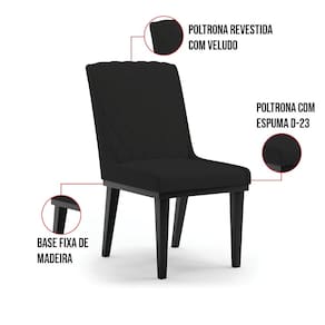 A Cadeira Sofia, é a opção ideal para quem quer um ambiente moderno e sofisticado! Um móvel super compacto, que se adequa perfeitamente em diversos ambientes. É uma ótima escolha para área de descanso, sala de estar, hall de entrada, espaço gourmet, varanda, recepção, escritório ou até mesmo para compor a mesa de jantar. Demais, né? Possui um design elegante, clássico e super convidativo, sem dúvidas ela dará um toque todo especial ao espaço que for posicionada. Feita em madeira maciça de eucalipto reflorestado, possui também base fixa em tom preto o que garante mais segurança, ótima sustentação e durabilidade à peça. O detalhe principal desta linda cadeira , fica por conta da alta-costura no encosto, em estilo matelassê. Um método aplicado no tecido de aparência acolchoada, o que confere um acabamento mais refinado à peça. Além do mais, os desenhos geométricos do tecido adicionam um toque luxuoso ao produto. Seu estofamento é feito com espuma D-23, revestida no Veludo, o que garante maciez e conforto, trazendo aquela sensação de abraço e suavidade ao sentar-se. E o que falar da cor Preto dessa cadeira ? Um tom extremamente elegante e versátil, perfeito para harmonizar com diferentes estilos de decoração. Afinal, não há nada melhor do que relaxar em uma Cadeira aconchegante, para ler um bom livro, ou assistir aquela série preferida, com o máximo de conforto possível, não é mesmo? Você irá se surpreender com o conforto da Cadeira Sofia. Aqui na D'Rossi, você encontra o que há de melhor em produtos, para você e sua família. Leve a sua e arrase!
