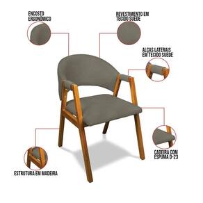 Transforme a sua sala de jantar com a Cadeira Yara, a escolha ideal para quem busca estilo, conforto e durabilidade. Com um design moderno e sofisticado, esta cadeira adiciona um toque de elegância a qualquer ambiente, seja na sala de jantar ou na cozinha. Sua base fixa em madeira e o revestimento em tecido Suede Grafite combinam facilmente com diferentes estilos de decoração, tornando sua mesa ainda mais convidativa. Feita com madeira de reflorestamento de eucalipto, a Cadeira Yara é sustentável e robusta, suportando até 120 kg. Sua estrutura sólida, acabamento impecável e espuma de alta qualidade D-23 garantem um assento confortável para aproveitar cada refeição com prazer. Os braços de madeira, além de apresentarem um design vazado elegante, possuem detalhes revestidos do mesmo tecido da cadeira, proporcionando flexibilidade e conforto para apoiar seus braços, tornando-os ideais para longos jantares em família ou almoços tranquilos. Além de sua qualidade superior, a Cadeira Yara é leve e fácil de transportar, adaptando-se a cozinhas e salas de jantar de todos os tamanhos. Aproveite esta oportunidade para renovar o seu espaço com uma cadeira que une beleza, funcionalidade e um preço irresistível. Não perca tempo, garanta a sua antes que o estoque acabe e leve para casa uma peça que vai transformar seu ambiente! Dimensões do Produto: Altura Total: 83 cm Largura Total: 57 cm Profundidade Total: 65 cm Peso: 10 kg Outras medidas: Altura do Encosto: 29 cm Largura do Encosto: 46 cm Largura do Assento: 49 cm Profundidade do Assento: 48 cm Altura do chão ao Assento: 45 cm Espessura do Assento: 5 cm Espessura do Encosto: 8 cm Espessura do Braço: 3 cm Especificações do Produto: Estrutura: Madeira Eucalipto Espuma: D-23 Tecido: Suede Peso Suportado: Até 120 Kg Tipo de Pés: Base de Madeira Tipo de Encosto: Fixo Tipo de Assento: Fixo Complexidade da Montagem: Baixo Montagem: O produto vai montado Garantia: 90 dias contra defeito de fabricação Instruções de Limpeza: Utilizar um pano limpo e levemente úmido Você irá Receber: 01 Cadeira Sala de Jantar - Entregue em: 01 Volume