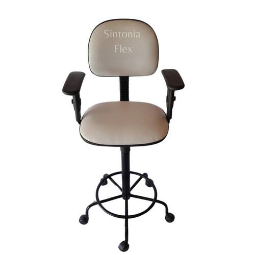 Cadeira secretaria caixa alta - braço com regulagem de altura - estrela de ferro com rodízio - aro - corano branco Cadeira caixa - aro para apoio dos pés - prolongador de altura - madeira reflorestada - espuma injetada - revestida em corano cipatex - bordas em pvc flexivel - pés de ferro com rodízio - pintura eletrostática epoxi - estrutura em aço com acabamento em pvc Altura do chão ao assento: Mínima 63 cm Máximo 75 cm Peso maximo recomendado: 110 kl Marca: Sintonia Flex