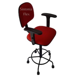 Cadeira secretaria caixa alta - braço com regulagem de altura - estrela de ferro com rodízio - aro - tecido vermelho Cadeira caixa - aro para apoio dos pés - prolongador de altura - madeira reflorestada - espuma injetada - revestida em corano cipatex - bordas em pvc flexivel - pés de ferro com rodízio - pintura eletrostática epoxi - estrutura em aço com acabamento em pvc Altura do chão ao assento: Mínima 63 cm Máximo 75 cm Peso maximo recomendado: 110 kl Marca: Sintonia Flex
