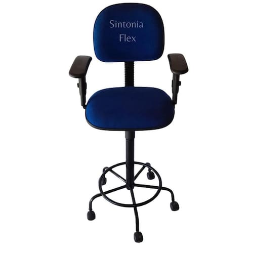 Cadeira secretaria caixa alta - braço com regulagem de altura - estrela de ferro com rodízio - aro tecido azul Cadeira caixa - aro para apoio dos pés - prolongador de altura - madeira reflorestada - espuma injetada - revestida em tecido j. Serrano anti-chama - bordas em pvc flexivel - pés de ferro com rodízio - pintura eletrostática epoxi - estrutura em aço com acabamento em pvc Altura do chão ao assento: Mínima 63 cm Máximo 75 cm Peso maximo recomendado: 110 kl Marca: Sintonia Flex Ean: 7895103600478