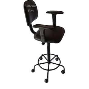 Cadeira secretaria caixa alta - braço com regulagem de altura com rodízio pra balcão recepção -mercado corano preto Cadeira caixa - aro para apoio dos pés - prolongador de altura - madeira reflorestada - espuma injetada - bordas em pvc flexivel - pés com rodízio Altura do chão ao assento: Mínima 63 cm Máximo 75 cm peso maximo 110 kl Marca: Sintonia Flex