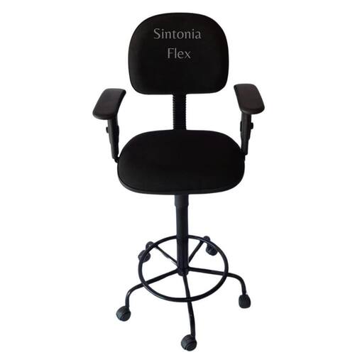 Cadeira secretaria caixa alta - braço com regulagem de altura com rodízio pra balcão recepção - tecido preta Cadeira caixa - aro para apoio dos pés - prolongador de altura - madeira reflorestada - espuma injetada - bordas em pvc flexivel - pés com rodízio Altura do chão ao assento: Mínima 63 cm Máximo 75 cm Marca: Sintonia Flex