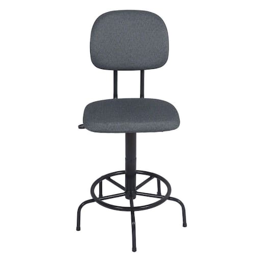 Cadeira secretaria caixa alta com Lduplo com base fixa para recepção mercado balcão tecido cinza/preto Cadeira secretaria caixa alta - - apoio para os pés - estrela de ferro - espuma injetada - madeira reflorestada - bordas em pvc flexivel - revestido em tecido j. Serrano anti-chama - prolongador de altura