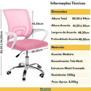 Tonalidade: Rosa | Altura: 94 | Produto: Cadeira Secretária Office | Largura: 48,50 | Material da Estrutura: Metal Cromado | Cor: Rosa | Peso do Produto: 8 | Fabricante: Magazine Decor | Cômodo Indicado: Escritórios | Selecione: Cadeira Secretária Office | do modelo: 1 | Exige montagem: Sim | Baterias são necessárias?: Não | Certificação de teste externa: Não | Is Fragile: Não | de caixas: 1 | Dimensões do artigo: 94x48,50x48,50 | da peça: 1 | Principais Características do Produto (bullet_point#0): A Cadeira de Escritório Secretária Base Giratória é perfeita para você deixar o seu espaço de trabalho ou estudo mais confortável e sofisticado! A Cadeira de Escritório Secretária é uma ótima escolha tanto para o seu conforto quanto para a sua decoração | Principais Características do Produto (bullet_point#1): A Cadeira de Escritório Secretária conta com uma base giratória com rodinhas, isso facilita consideravelmente a sua navegabilidade na mesa de trabalho. Sem contar com seu apoio de braço, ideal para você estudar ou trabalhar de forma mais aconchegante e confortável. | Principais Características do Produto (bullet_point#2): Outro diferencial da Cadeira de Escritório é que ela é produzida com materiais e acabamentos de alta qualidade, seu assento é feito em Madeira Compensada com revestimento em tecido, já a sua estrutura é feita em metal cromado | Peso do pacote: 8 | Componentes incluídos: Rodízios | Quantidade de itens: 1 | Dimensões do item P x L x A: 94x48,50x48,50