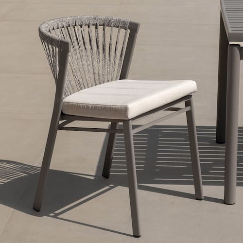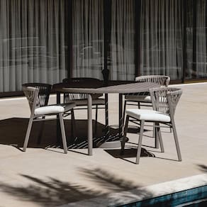 Nossos móveis de jardim são uma combinação perfeita de modernidade e funcionalidade, apresentando estruturas de linhas simples e tramas lineares e minimalistas em fita náutica. Este acabamento, manualmente elaborado por artesãos, acrescenta uma sofisticação incomparável a cada peça, tornando-as únicas.