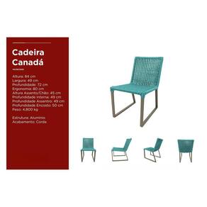 A cadeira Canadá possui estrutura em alumínio, pintura eletrostática e um trabalho manual em corda náutica, a perfeita harmonia dos materiais a transforma em uma peça única. Todos os produtos Aluminas são feitos sob medida com uma infinidade de cores para personalizá-los deixando seu ambiente como você deseja. Acabamento da Estrutura: Pintura Altura do assento até o chão: 45 Ambiente Principal: Jardim e Varanda Cor: Verde/Cinza Cor do Produto: Verde/Cinza Escala de Brilho: Semi-Brilho Estrutura do Assento: Alumínio e Corda Estrutura do Encosto: Alumínio e Corda Giratória: Não Itens Inclusos: 1 Cadeira Manual de Montagem e Instalação: https://cdn2.madeiramadeira.com.br/atributo/aluminas/1157835-1144746-certificado-de-garantia-aluminas-2019.pdf Necessita Montagem: Não Origem do Produto: Nacional Peso: 4.8 Possui Apoio Para os Pés: Não Possui Rodízio: Não Recomendações de Uso, Manutenção e Limpeza: Facilidade na limpeza e manutenção. Resistente à Chuva: Sim Suporta Até (kg): 120 Tipo de Assento: Fixo Marca: Ampiezza