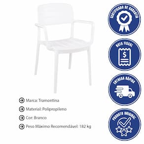INFORMAÇÕES DA CADEIRA TRAMONTINA - Peso Máximo Recomendável: 182 kg - Fabricação: Polipropileno e Fibra de Vidro Injetado - Empilhável até: 6 peças