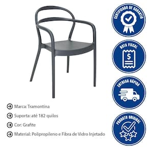 DESCRIÇÃO DA CADEIRA TRAMONTINA SISSI - Beleza, modernidade e resistência para sua casa com a cadeira Tramontina Sissi em polipropileno e fibra de vidro com braços grafite. - Produzida com design inspirado em umas das imperatrizes mais famosas da Áustria, ela garante modernidade e versatilidade para seus ambientes, além de alta resistência, pois suporta até 182 quilos. - Escolha Tramontina, tenha beleza e qualidade unidas em um único item!