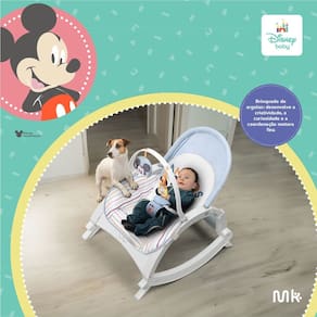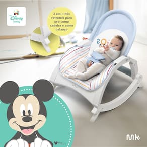 Com design encantador inspirado no Mickey e na Minnie, a cadeira possui barra de brinquedos removivel com dois acessorios interativos um chocalho que estimula o desenvolvimento auditivo, visual e motor, e um brinquedo de pano sensorial que desperta a curiosidade e a coordenacao do bebe.