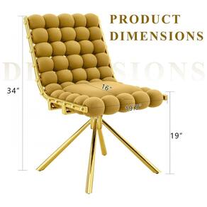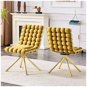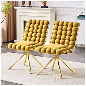 O conjunto TesNus reúne duas cadeiras de jantar giratórias estofadas em veludo mostarda, com assento e encosto em módulos acolchoados tipo bubble, sem braços, indicadas para salas de jantar, cozinhas, salas de estar e áreas de maquiagem. Cada cadeira utiliza base giratória de 360° com estrutura metálica em acabamento dourado e ponteiras antiderrapantes, mantendo o assento estável, sem rodas, para uso interno em superfícies rígidas.