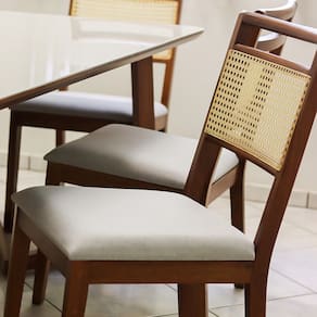 Cadeiras para Mesa de Jantar Madeira Maciça - Luna - Art Salas As Cadeiras Luna possuem um design moderno e funcional. Sua base é feita de madeira maciça Tauari, possuem espuma na densidade D-24, e encosto em fibra de rattan. Seu assento suporta até 150 kg distribuídos. Confira e aproveite! Fazem parte do anúncio: 2 Cadeiras Luna Obs: Objetos de decoração não fazem parte deste anúncio Particularidades da Cadeira: Características: - Estrutura em Madeira Maciça Tauari. (laminada) - Assento estofado - Espuma com Densidade D-23 - Design moderno, sofisticado e diferenciado. - Madeira Ecologicamente Correta. - Baseado em conceitos sustentáveis. - Madeira altamente resistente. -Suporta até 150 kg distribuídos - Encosto com telinha ( Rattan) Dimensões da Cadeira: Altura: 92 centímetros Largura: 49 centímetros Profundidade: 48 centímetros Informações Importantes: -Produtos podem apresentar diferenças de tonalidades entre a foto na tela e o produto real, devido a calibração de cor de tela. -Limpar com flanela ou pano macio. Não utilizar álcool. Não utilizar produtos abrasivos ou corrosivos -Nós prezamos pela qualidade da entrega em primeiro lugar, trabalhamos com transportadoras altamente selecionadas e os melhores materiais de embalagem. - As cadeiras vão 100% montadas nas caixas e embaladas. Não necessita da montagem de um profissional. -Certifique-se de que o produto caiba em elevadores e vãos de escadas, não fazemos içamentos ou desmontagens de produtos. Quaisquer despesas deste tipo ficam a cargo do cliente -Garantia de 3 meses contra defeitos de fabricação Marca: Art Salas