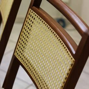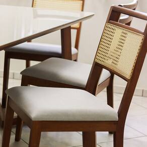 As Cadeiras Luna possuem um design moderno e funcional. Sua base é feita de madeira maciça Tauari, possuem espuma na densidade D-24, e encosto em fibra de rattan. Seu assento suporta até 150 kg distribuídos. Confira e aproveite!