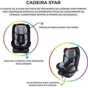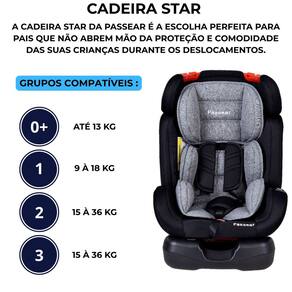 Cadeirinha para carro bebê passear star grup o+ i ii e iii 0 à 36 kg preto com cinza A cadeira star da passear é a escolha perfeita para pais que não abrem mão da proteção e comodidade das suas crianças durante os deslocamentos. Projetada para acompanhar o crescimento da criança, a cadeira star é um dispositivo de retenção para o grupo 0+, 1, 2 e 3, suportando pesos de 0 até 36kg, garantindo proteção desde os primeiros dias até a infância. Com 4 posições de reclíno, a cadeira star oferece o máximo de conforto, permitindo que a criança relaxe durante o trajeto, seja uma rápida corrida até a escola ou uma longa viagem em família. O tecido removível e lavável facilita a limpeza e manutenção da cadeira, garantindo que ela esteja sempre pronta para uso, mesmo após as aventuras mais animadas. Principais características: - dispositivo de retenção para crianças do grupo 0+, 1, 2 e 3 de 0 até 36 kg - cinto de segurança de 5 pontos - ajuste de altura do cinto de segurança do drc - cadeira com sistema de instalação com cinto de segurança do carro - possui 4 posições de reclino - tecido removível e lavável - base robusta - inmetro: 010935/2022 - certificado nbr 14400 - de 12 meses direto com o fabricante Marca: Não Informado