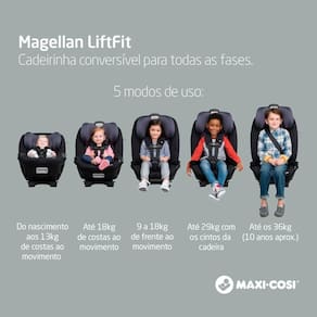 A Cadeira para Auto Maxi-Cosi Magellan LiftFit é feita para proteger seu pequeno por uma década! Com 5 modos de uso, esta cadeirinha tem o uso recomendado do nascimento aos 10 anos de idade (0 a 36 kg) e possui tecnologia QuikFit, com apoio de cabeça integrado ao cinto que fornece 14 posições facilmente ajustáveis com apenas uma única mão. Além disso, seu bebê desfrutará de 7 diferentes posições reclináveis para máximo conforto nas viagens. O indicador de instalação mantém a inclinação ideal, independente do formato do banco do veículo.