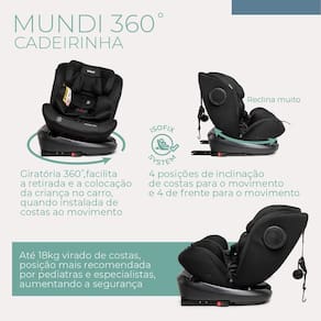 Características: Instalação ISOFIX e Top Tether: Garante uma instalação rápida, fácil e segura, minimizando erros e aumentando a estabilidade. Rotação 360: Permite girar a cadeira para a porta, facilitando a colocação e retirada do seu filho sem esforço e com segurança. Inclinação Ideal para Recém-Nascidos: Equipada com almofadas redutoras e super inclinação, oferece o máximo de conforto e ergonomia para os menores. Longa Durabilidade: Aprovada para uso desde o nascimento até os 36 kg, com ajustes que acompanham o crescimento da criança. Ajuste Prático de Cabeça e Cintos: Possibilita ajustar a altura do apoio de cabeça e do cinto de segurança simultaneamente, sem necessidade de desmontar partes da cadeirinha. Armazenamento Inteligente de Cintos: Os cintos podem ser guardados na própria estrutura quando não são necessários, simplificando a transição para o uso dos cintos do veículo nos Grupos 2 e 3.