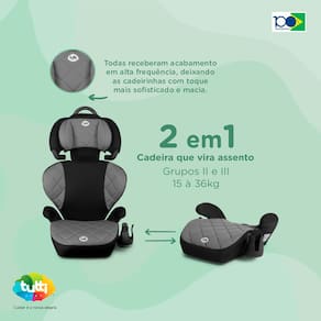 Para crianças de 15kg até 36kg, a Cadeira Triton II é uma excelente opção de custo benefício. São 2 produtos em 1, a Cadeira que também vira Assento de Elevação, para acompanhar todas as fases dos seus filhos proporcionando conforto e segurança aos passeios.