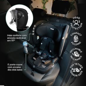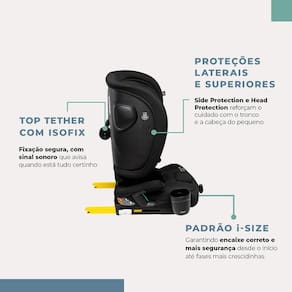 Características Indicação: Para crianças de 9 a 36 kg. Instalação: Fácil e segura com o sistema Isofix e Top Tether. Sinal Sonoro: Indica fixação correta do Top Tether. Estrutura Europeia i-Size: Maior estabilidade e segurança em caso de impacto. Proteção Avançada: Head Protection para a cabeça e Side Protection para impactos laterais. Encosto Reclinável: Até 117 para acompanhar o crescimento da criança com conforto ergonômico. Porta-Copos: Lateral, encaixa nos dois lados. Compact Folding: Fácil de dobrar e guardar quando não está em uso.
