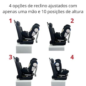 Grupo 0/1/2/3 Instalação com ISOFIX com prático sistema de rotação 360, ajustável com uma mão. Instalação com o cinto de segurança de 5 pontos do veículo Instalação contra o movimento para uso desde o nascimento até 13Kg Instalação a favor do movimento para uso a partir de 9kg até 36kg Contra o movimento a posição de reclino é de bebê conforto indicado pela letra R na base da cadeira 3 posições de reclino na instalação a favor do movimento Há almofadas ajustáveis para o uso nos grupos 0 e 1 para maior conforto e segurança do bebê Possui uma proteção extra contra impacto lateral. 10 posições de ajustes de altura fazendo com que a cadeira cresça junto com a criança Tecidos e espuma sofisticadas e suaves ao toque Tecido respirável Botões de ajustes em cores contrastantes para facilitar a visualização. Cinto de segurança de 5 pontos para usos nos grupos 0 e 1.