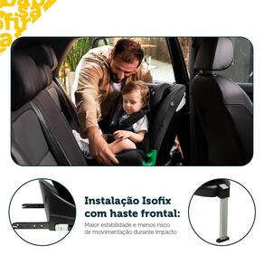 Especificações Técnicas: Norma ABNT: NBR 14400:2020 Certificação i-Size: de 40 a 150 cm (aproximadamente do nascimento até 12 anos) Instalação: sistema Isofix + haste frontal Rotação: 360 em todas as faixas de uso Reclinável: múltiplas posições de inclinação Redutor: acolchoado e removível para recém-nascidos Encosto de cabeça: ajustável com tecnologia SafeSide Cinto de segurança: 5 pontos com protetores acolchoados, ajustável em altura e largura Material/Composição: Tecido: poliéster, PU e algodão | Estrutura: aço, alumínio, PP e EPP Dimensões (A x L x P): 55 x 45,5 x 54 cm Peso do produto: 9,5 kg Conteúdo da embalagem: 1 cadeirinha, 1 manual de instruções e 1 par de guias de instalação Garantia do fornecedor: 12 meses Imagens meramente ilustrativas.