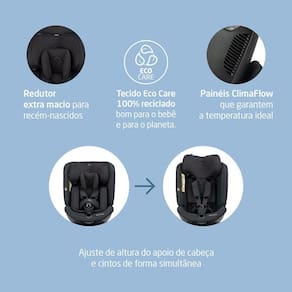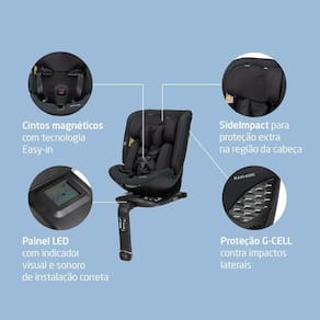 Máximo conforto e segurança com visor LED que indica quando a cadeira está "pronta para sair". Possui giro 360 em todas as idades e proteção contra impactos laterais.
